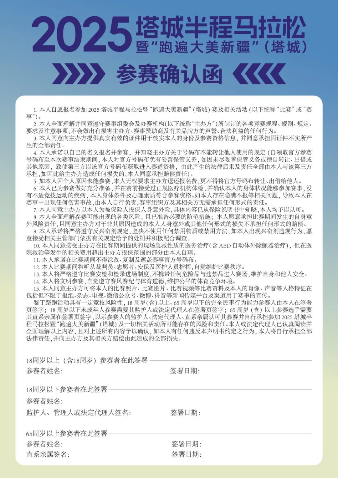 2.鉴于路跑活动具有一定竞技风险性,18周岁(含)以上、65周岁以下的完全民事行为能力参赛人由本人在签署页签字;18周岁以下未成年人参赛需要其监护人或法定代理人在签署页签字;65周岁(含)以上参赛选手需要其直系亲属在签署页签字,以示参赛人的监护人、法定代理人、直系亲属认可其参赛并自行承担参加2025塔城半程马拉松暨“跑遍大美新疆”(塔城)赛及一切相关活动所可能存在的风险和责任。本人或法定代理人已认真阅读并全面理解以上内容,且对上述所有内容予以确认,如本人有任何违反本声明书约定之行为,本人将自行承担全部法律责任,并向主办方及其相关方赔偿由此造成的全部损失。